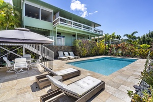 Your private pool area offers a sun-drenched oasis surrounded by lush greenery. Relax on a lounge chair, rinse off in the outdoor shower, or enjoy a quiet morning coffee in the secluded lower lanai. Coastline views, swaying palms, and evening breezes complete this tropical sanctuary.