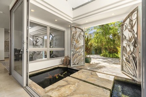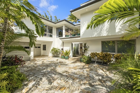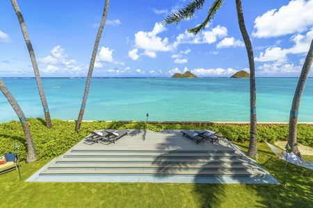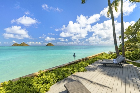 A long private gated driveway leads to the main courtyard with a 2-car garage, storage space as well as an electric vehicle charging station. The home’s backyard features an elevated oceanside lanai where chaise lounge chairs, a hammock, and swaying palms beckon you to soak up some tropical sun. Just feet away, the dazzling turquoise waters and gentle lapping waves of Lanikai Beach will make you feel like you’ve stumbled upon your own private isle!