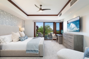 • Primary Suite – King bed, HD TV, workspace, central AC, ceiling fan, walk-in closet, private ocean-view lanai; ensuite bathroom with soaking tub, walk-in shower, dual vanities, and private outdoor shower garden