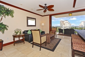 As you enter this luxurious condo, you're welcomed by an ambiance that seamlessly blends indoor and outdoor living. The spacious living area, with its deluxe furnishings, opens up to a beautiful pocket-door lanai. This extension of living space creates the perfect environment for gathering, relaxing, or enjoying island breezes with panoramic views.