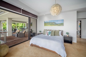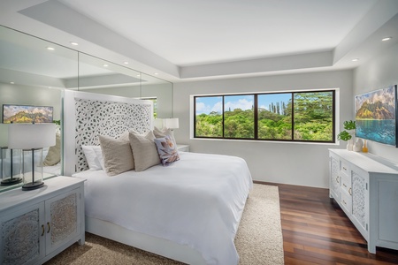 Hanalei Plantation Villa features an expansive, flowing floor plan in which the upper-level living spaces open to bring the outdoors in, emphasizing the breathtaking mountain and waterfall views. The home also includes an additional living space on the lower level, a fully equipped kitchen with bar seating and a steam room. Each of the three sumptuous bedrooms offers access to a lanai, enabling guests to enjoy cool trade winds as they blow through the villa. The bathrooms provide spa-like amenities such as soaking tubs, a walk-in shower with dual shower heads, and an open-air shower. The fourth bedroom is an ideal room for yoga and meditation lovers, with ample natural light and ventilation. Includes a dedicated yoga space and note that there are no window coverings or air conditioning.