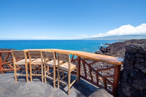 Framed by lava rock and tropical landscaping, the infinity pool seems to pour into the horizon. Lounge chairs and shaded seating create multiple vignettes for relaxation, while the firepit patio and upper balcony capture golden-hour views of Mauna Kea. Outdoor showers, ceiling fans, and generous seating areas extend every gathering into the open air. Beach chairs, umbrellas, boogie boards, coolers, and towels are provided for off-property adventures.
